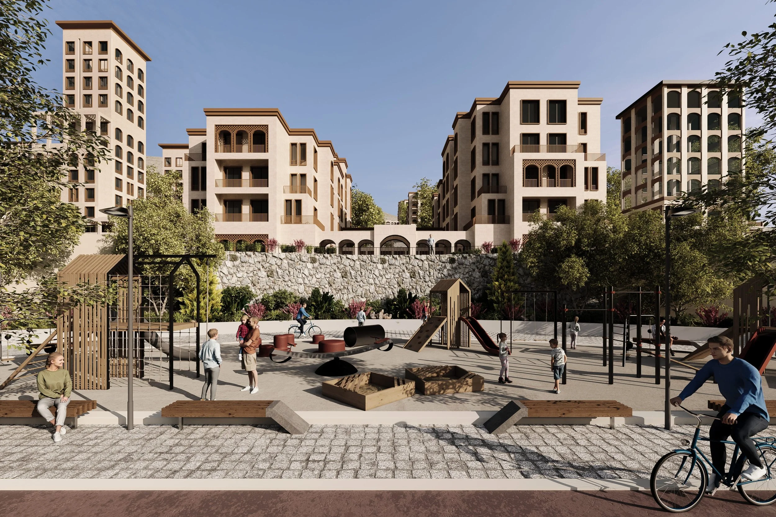 Narinj Yafour is a visionary masterplan conceived as a catalyst for Syria’s long-term reconstruction, rooted in dignity, community, and collective renewal. Located in Yafour, just 20 minutes from central Damascus, the project combines peaceful living with strong connectivity to the capital. The masterplan is inspired by the structure of the Narinj (orange) tree, a symbol of growth, resilience, and rootedness. A central boulevard forms the trunk of the city, hosting civic, business, and cultural life, from which four main mixed-use branches extend into the neighbourhoods. These branches are anchored by public plazas that act as gateways and community hubs, integrating schools, clinics, and shared facilities. Residential “leaves” unfold beyond, forming human-scaled, family-oriented clusters designed for safety, walkability, and belonging. Richly layered public, semi-private, and private green spaces weave through the plan, reinforcing social interaction and environmental comfort. Narinj Yafour is more than a development - it is a contemporary Syrian city shaped by heritage, purpose, and a forward-looking vision.